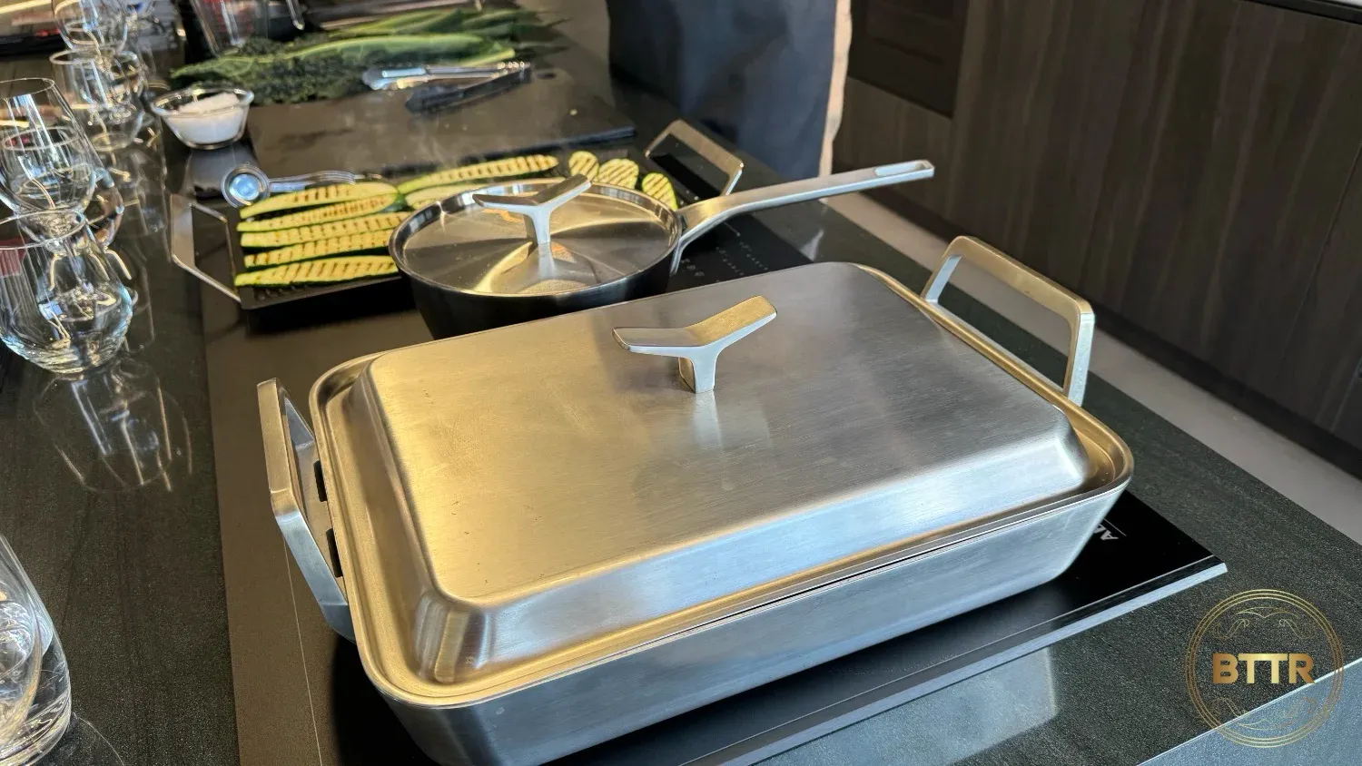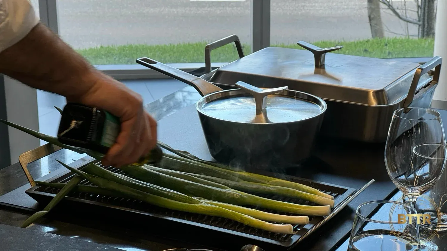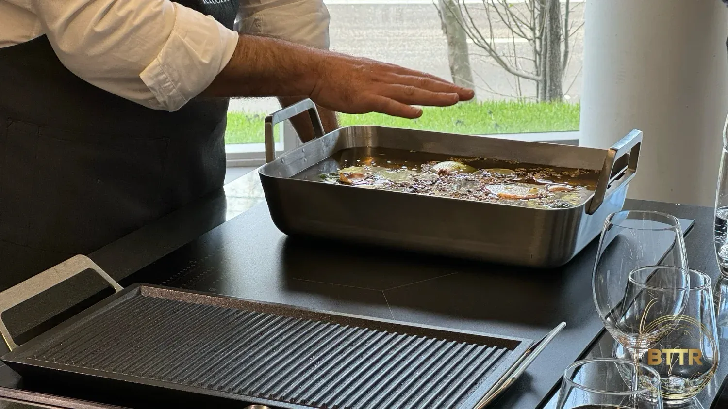 While he was cooking, the chef took time to highlight some features he particularly liked on the SapphirMatt, like the Bridging controls. This function allowed him to use a large induction grill stretched across two of the cooking zones, with the linked zones sharing temperature and timer controls.